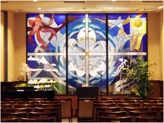 ホール正面のステンドグラス(写真上)のテーマは神様による天地創造です。富士山、田畑、桜、そして北斎の版画にある波をあしらった図柄からわかるように、日本も神様が人間におくってくださった素晴らしい創造の賜物の一部です。明るい青は地球をおおう海を示します。そして、地球以外にも太陽、月、星といった神様の創造物が描かれています。