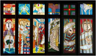 右側面の6枚の図柄(写真上 左より)は、マタイによる福音書25章35節~40節「あなたがたは、わたしが飢えていたときに食べさせ、のどが渇いていたときに飲ませ、旅をしていたときに宿を貸し、裸のときに着せ、病気のときに見舞い、牢にいたときに訪ねてくれた。」を描写したものです。それぞれの上部の窓に描かれた絵は、人間に対する神様の愛を示します。下の大きい絵は、クリスチャンである私たちの、人々に対する憐れみの行為を示します。そしてまた、私たちが他者に助けの手を差しのべることは、キリストご自身に対してそれをすることでもあります。つまり、人々に向けた私たちの慈悲の行為は、イエス・キリストご自身への私たちの愛の行いとなるのです。